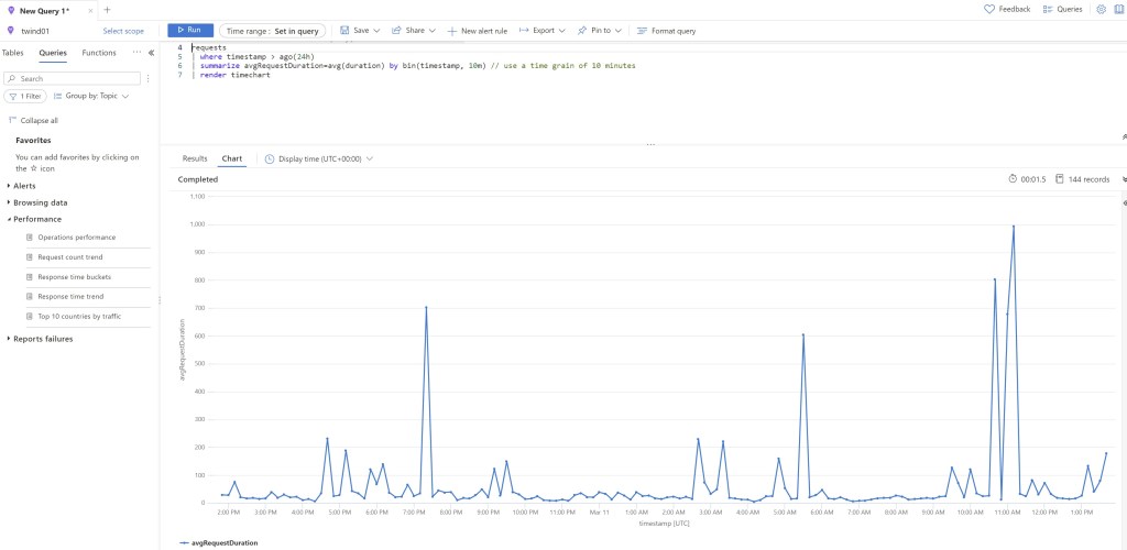 requests | where timestamp > ago(24h) | summarize avgRequestDuration=avg(duration) by bin(timestamp, 10m) // use a time grain of 10 minutes | render timechart