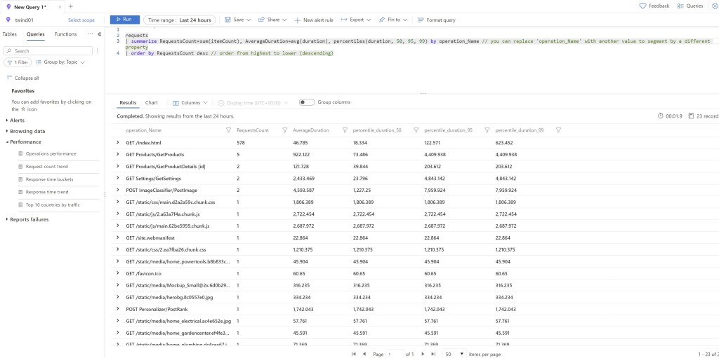 We can also use Log Analytics in order to inspect the website’s telemetry data. For example, with the following KQL query I can create a chart that shows the request count during the day (in order to know when my B2B site is frequently accessed and what are the critical endpoints):