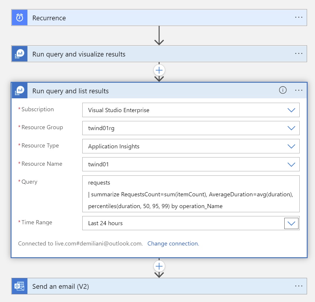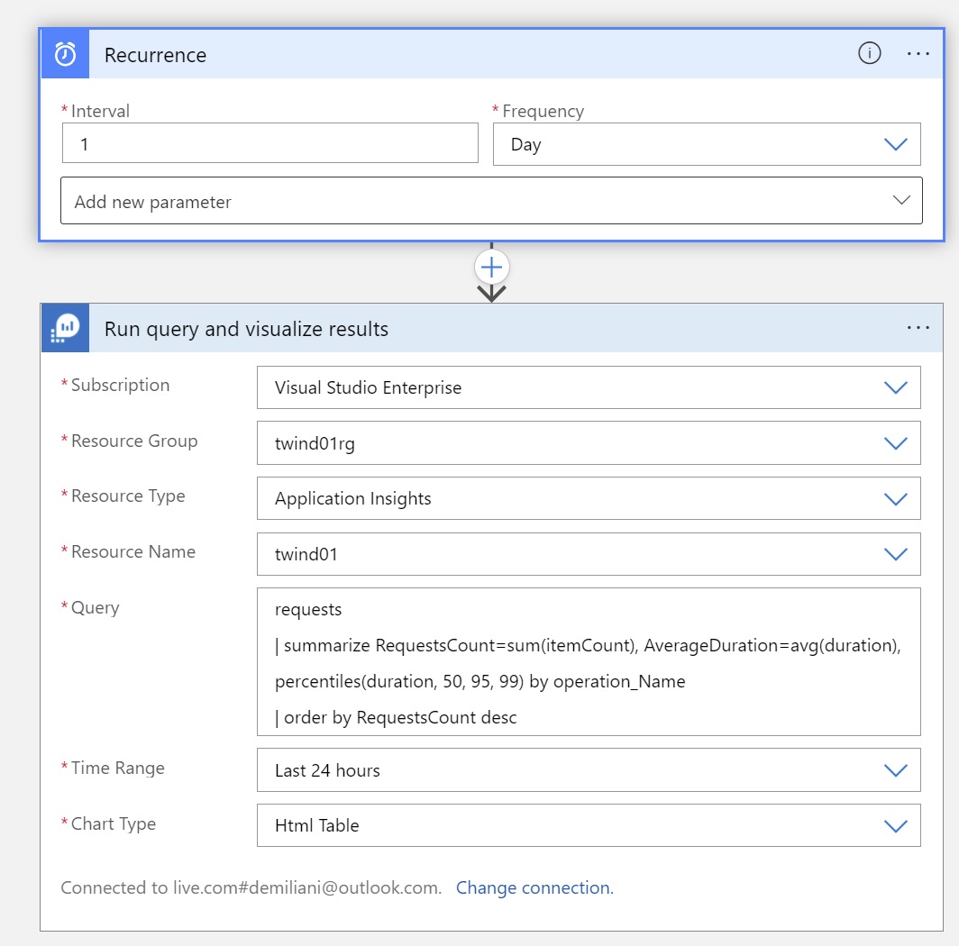 Open the Azure Portal and create a new Azure Logic App. We need to use the Recurrence action (in order to have a timer-triggered workflow) and also the Run query and visualize results action under the Azure Monitor Logs connector.