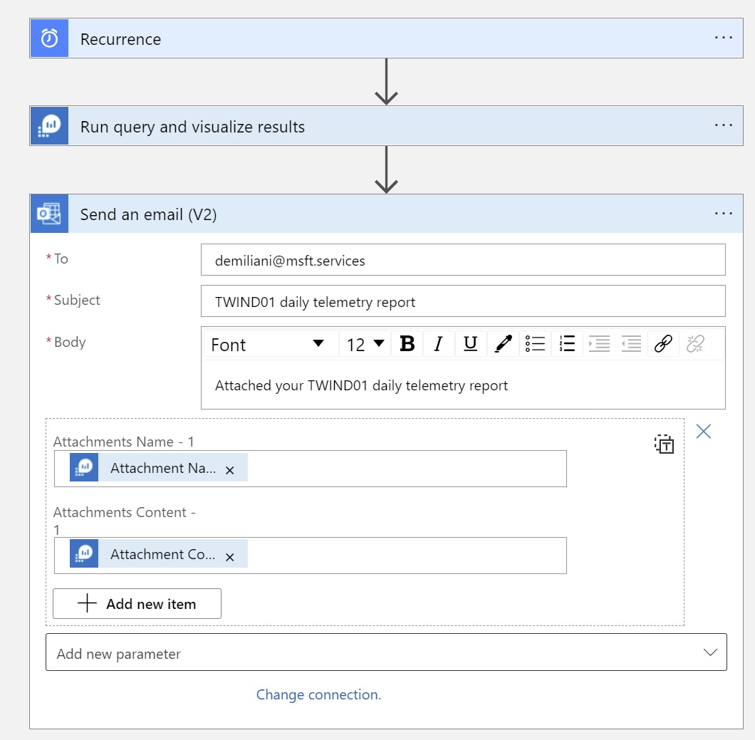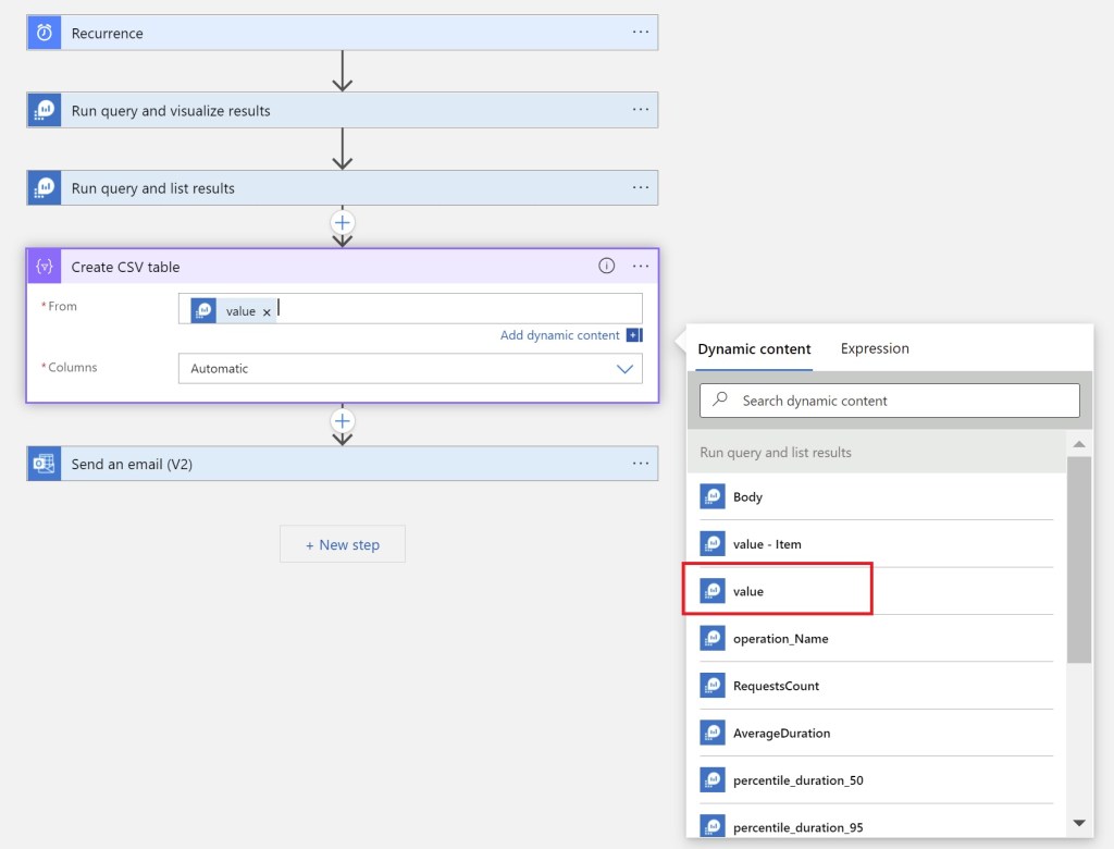You can also improve the workflow and modify it in order to have also a CSV report in your mailbox. For this, add a new action from the Azure Monitor connector called Run query and list results and configure it as follows: