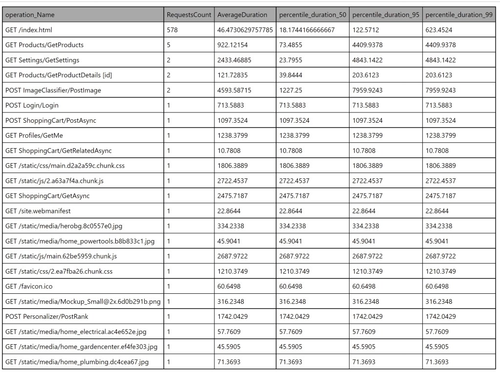 requests | summarize RequestsCount=sum(itemCount), AverageDuration=avg(duration), percentiles(duration, 50, 95, 99) by operation_Name | order by RequestsCount desc