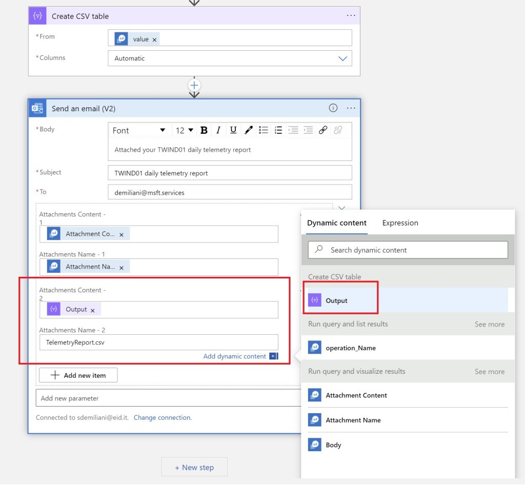 Then we can add an action for sending the report (output of the previous action) as attachment of a mail message (using the Outlook connector):