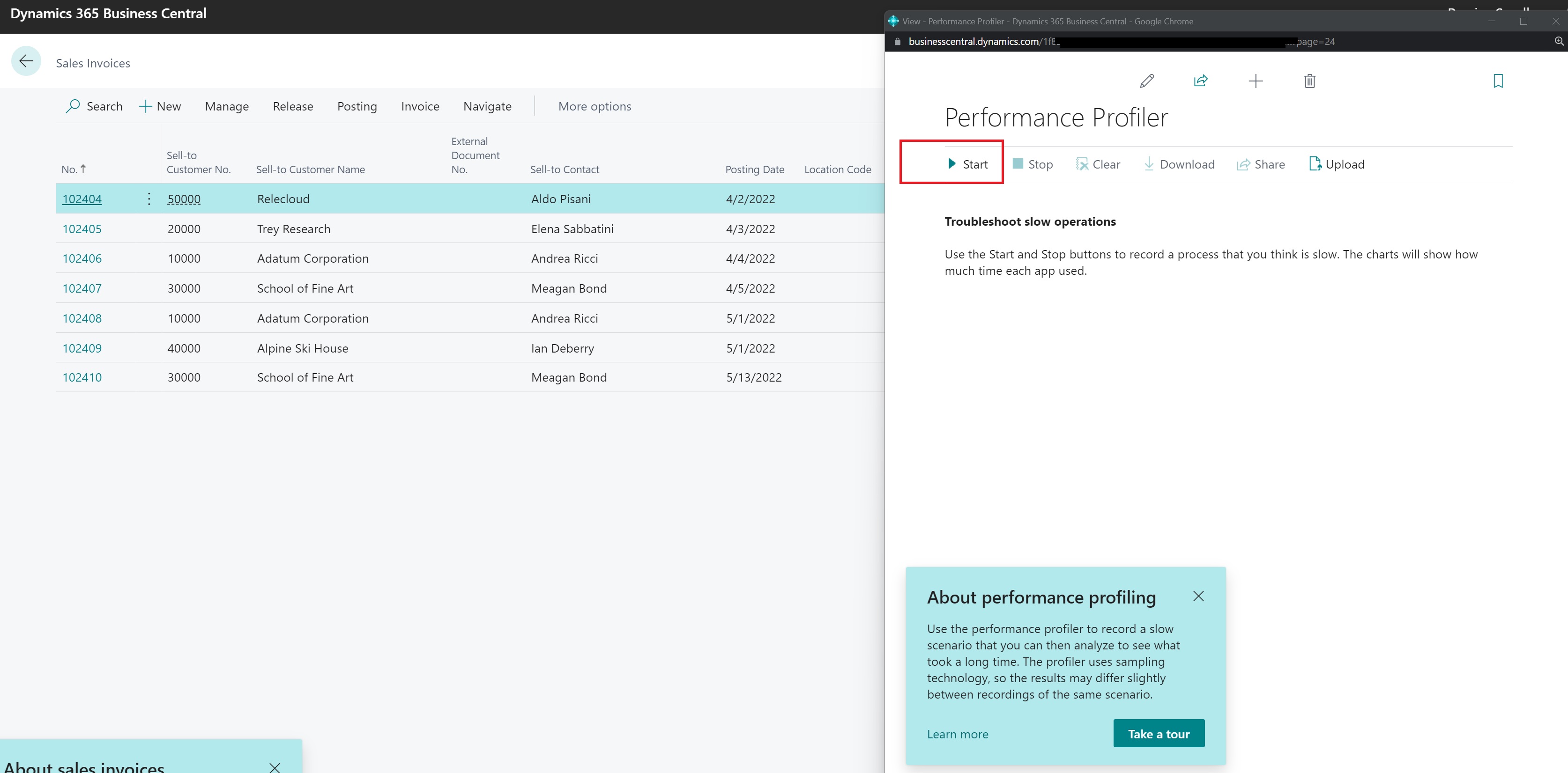 With the two windows opened (Sales Invoice list and Performance Profiler page), now let’s start the Performance Profiler (by clicking the Start button) and, when started, let’s execute your process to monitor (in my case, opening the Sales Invoice card and doing some actions):