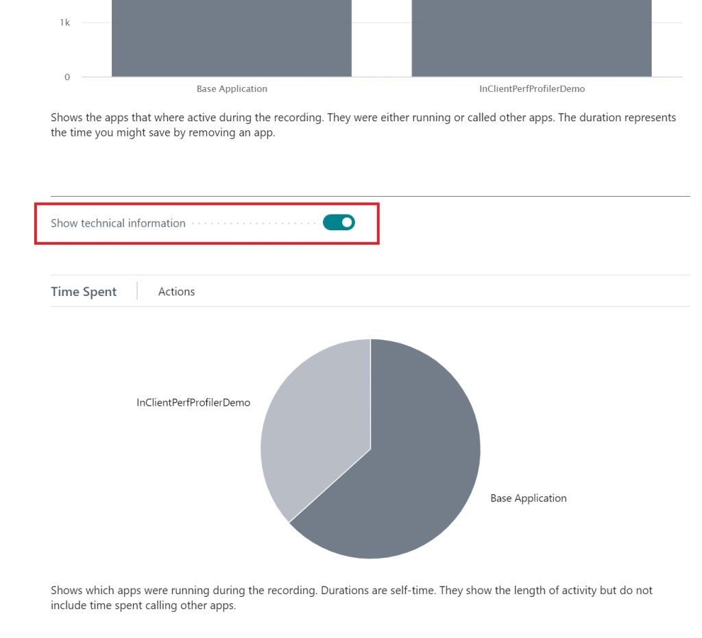 You can also click on the Show technical information toggle in order to discover more things. The Time Spent pane shows you which apps were runnig during the recording of the process and the the length of the activity per app (time spent calling other apps is not included):