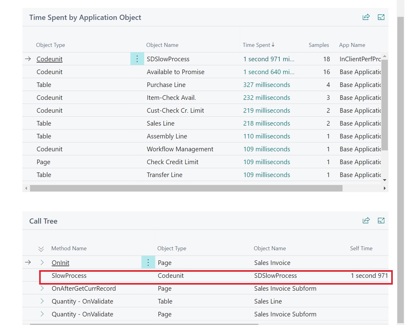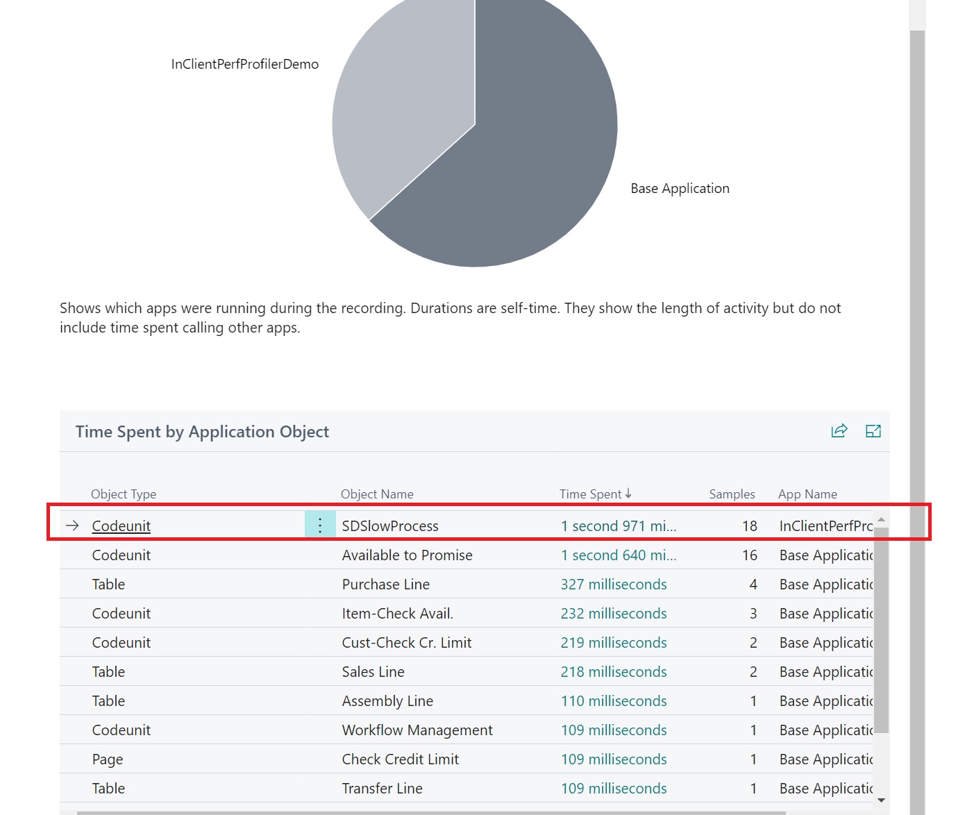 If you click on Time Spent by Application Object, you can discover the time spent on each object involved in the monitored process, ordered by Time Spent descending. Here we can discover that the codeunit called SDSlowProcess is what takes a lot of time: