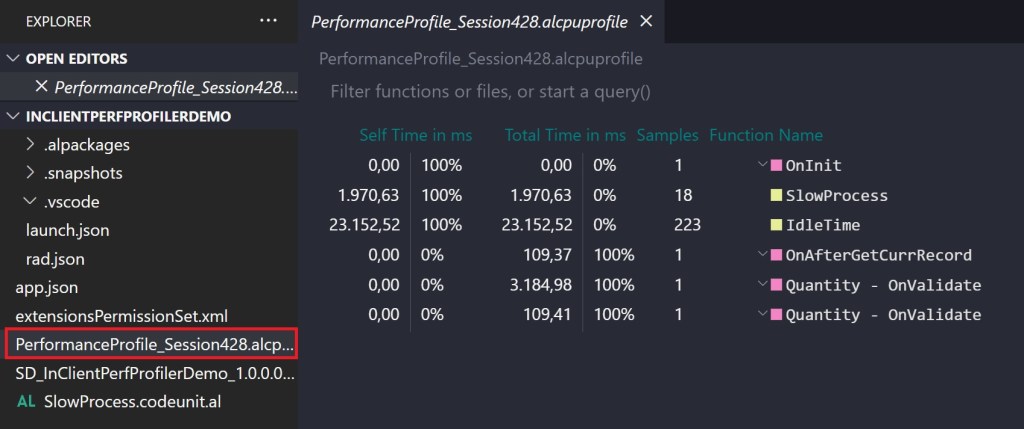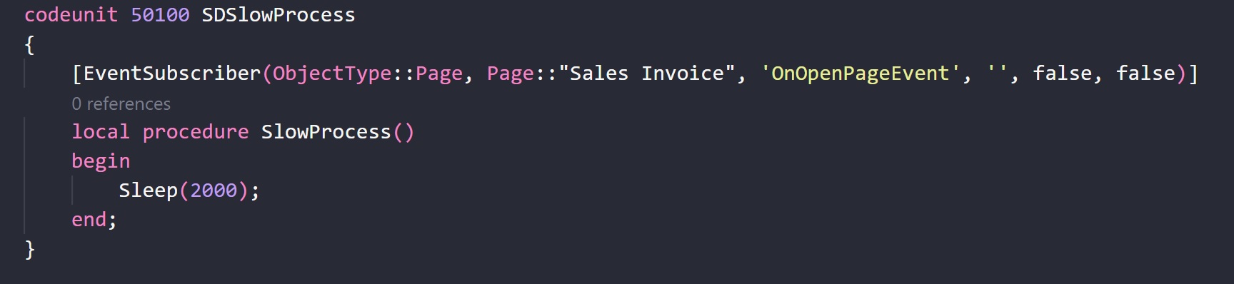 For this scenario, let’s imagine that I’ve developed an extension (here called InClientProfilerDemo) that creates a performance problem on the Sales Invoice page. To simulate this, I’ve simply created an extension with a codeunit and the following event subscriber: