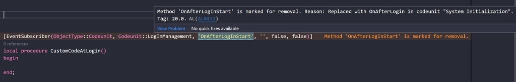 Method 'OnAfterLogInStart' is marked for removal. Reason: Replaced with OnAfterLogin in codeunit "System Initialization". Tag: 20.0.AL (AL0432)