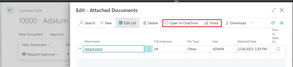 Dynamics 365 Business Central 2022 Wave 1 (version 20) enhanced the integration with Onedrive for Business, the cloud storage service that is included in Microsoft 365. Business Central v20 makes now very easy to store, manage, and share files with other people through OneDrive with a set of predefined actions that you can have on some entities, for example Attachments: