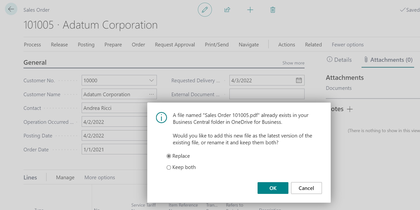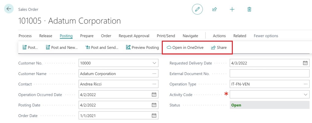 - Open in Onedrive: calls the OpenInOneDrive(FileName: Text; FileExtension: Text; InStream: InStream) method of the Document Service Management codeunit for copying documents stored as BLOBs to OneDrive and opening the documents.