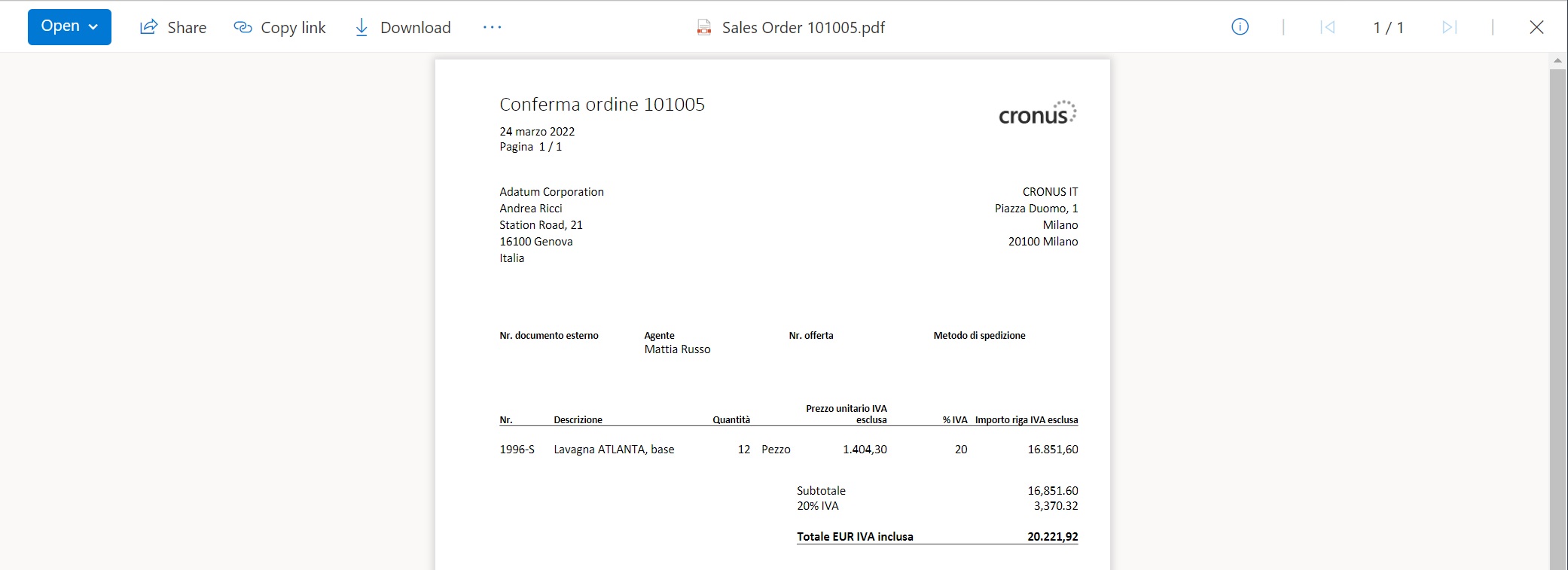 When you select the Open in Onedrive action, the document is uploaded to the Business Central folder in Onedrive and opened: