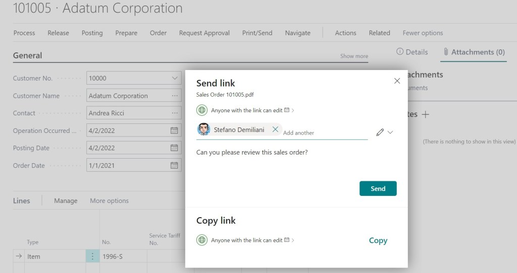 - Share in Onedrive: calls the ShareWithOneDrive(FileName: Text; FileExtension: Text; InStream: InStream) of the Document Service Management codeunit for copying documents stored as BLOBs to OneDrive and sharing the documents with other people.