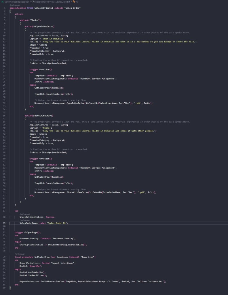 To add the Onedrive integration in my Sales Order page, I need to create a pageextension object and here add the two actions: