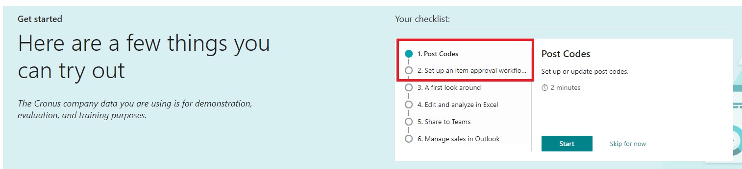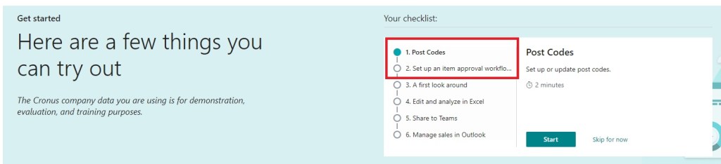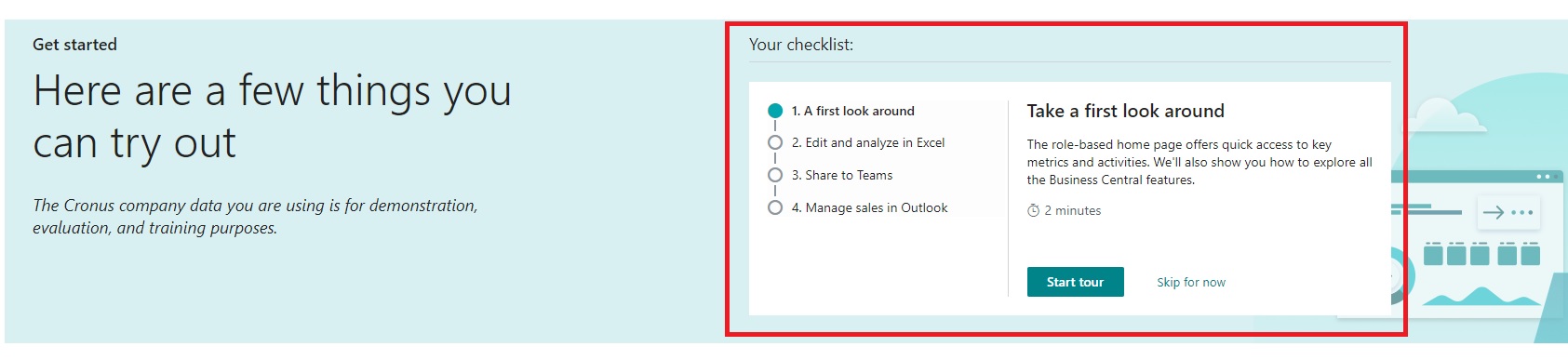 When the user hits Get started on their Home page (role center), a checklist is revealed inside the banner. The checklist provides users with an overview of their onboarding activities, while allowing them to learn and explore at their own pace. A checklist is made of a serie of tasks. You can customize these tasks by going to the Checklist Administration page: