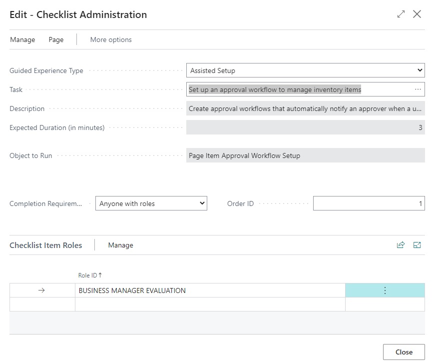 Here you can see a list of pre-defined tasks assigned to particular profiles and you can also create your own custom tasks by going on New|Create checklist item. Here for example I can define that my BUSINESS MANAGER EVALUATION profile needs to start the Assisted Setup for setting up an approval workflow to manage inventory items:
