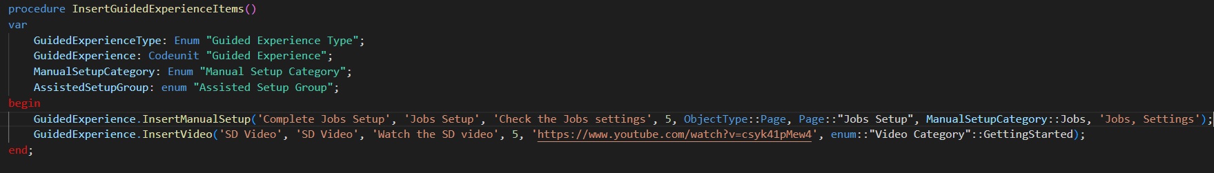 Here I’m creating 2 tasks, one is a manuale setup for Jobs and the other is a Video task. Best way is to do this via an Install codeunit in your app, but this code can also be triggered manually if needed.