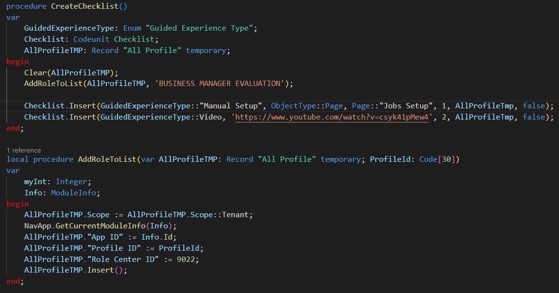 When you have created checklist items and added them to the Guided Experience Item table, you can also create a checklist for a particular profile via AL code. To do that, you can do like in the following code: