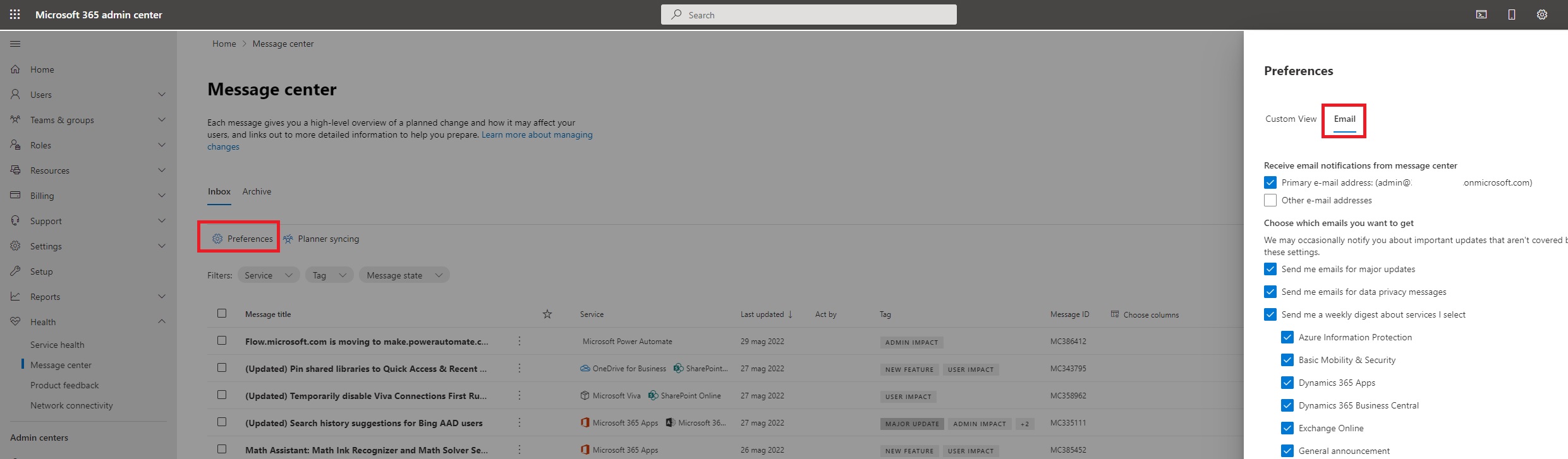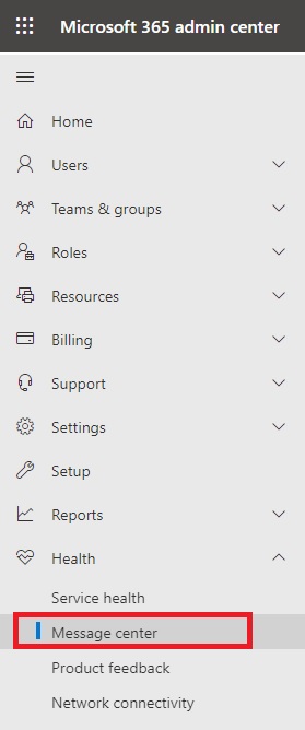To do that, connect to Microsoft 365 Admin Center and select Health|Message center: