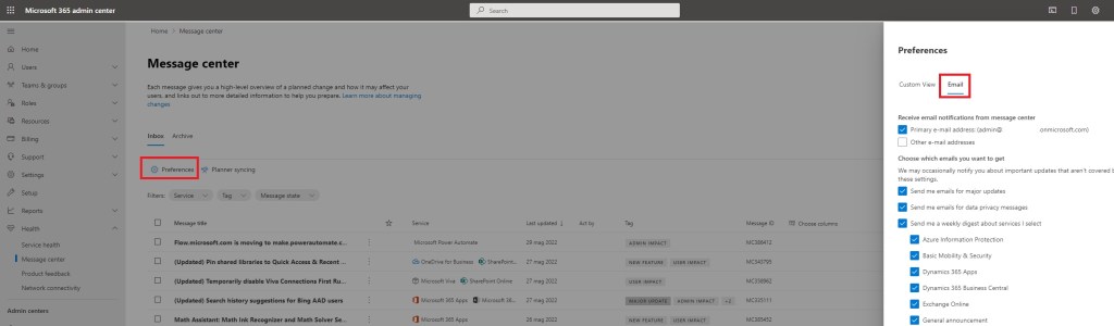 NOTE: at the time of writing this post, there’s no an automatic transition of email addresses from Dynamics 365 Business Central Admin Center to Microsoft 365 Message center.
