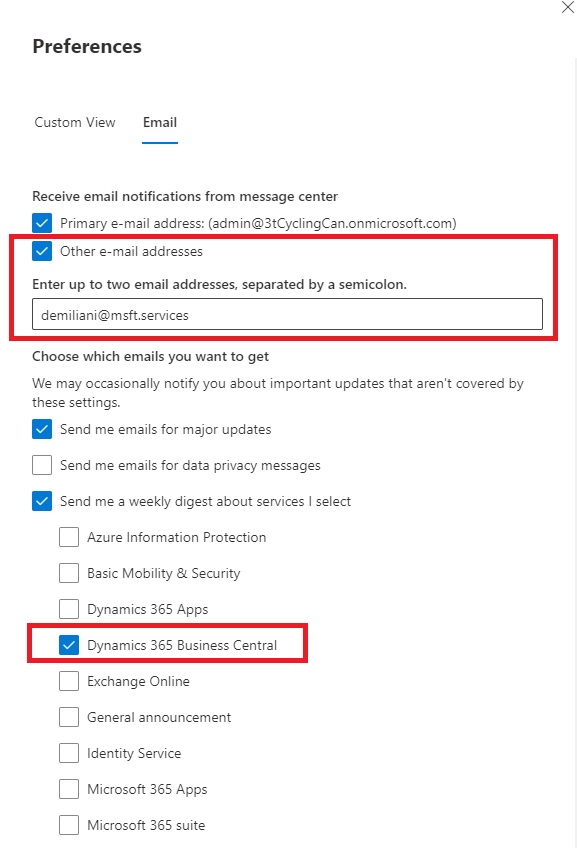 Your tenant’s primary email address is listed and automatically selected. To other new notifications email addresses, click on Other e-mail addresses and enter up to two email addresses, separated by a semicolon. You can also specify the emails you want to receive (also not related to Dynamics 365 Business Central only):