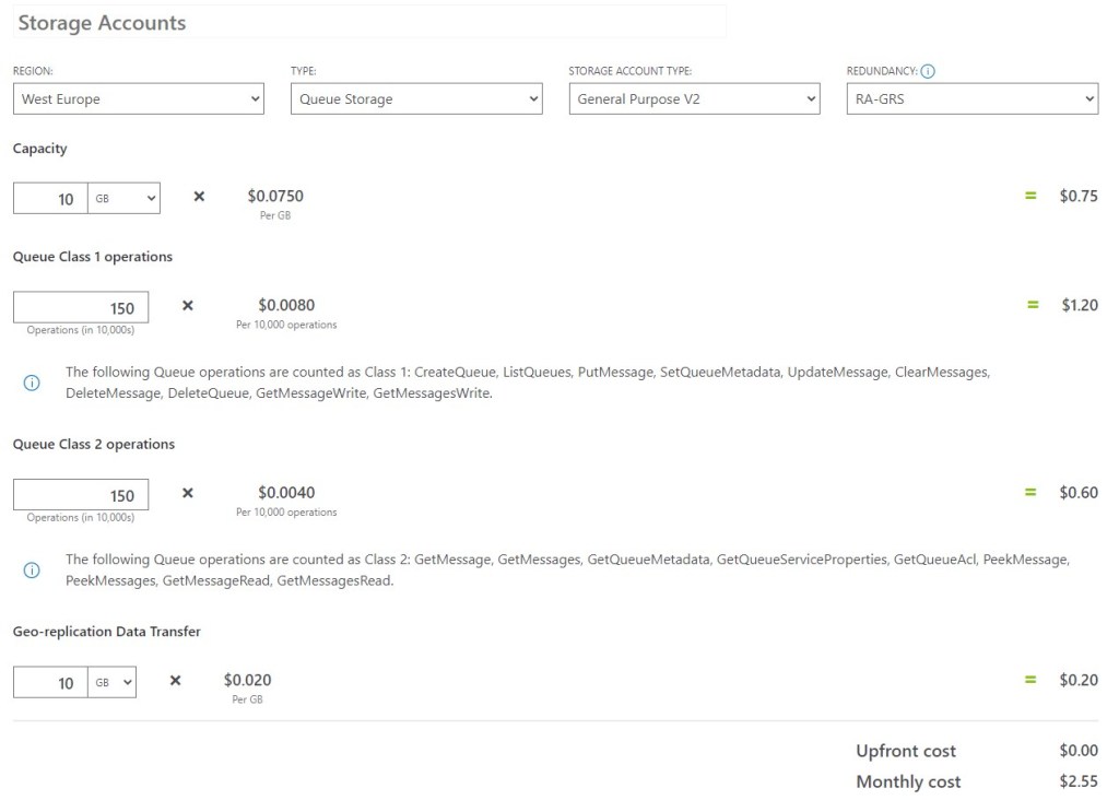 Regarding cost of this service: you only pay for the storage used, and the operations you perform on this queue (in blocks of 10000). As an example, at the time of writing this post a read-access geo-redundant storage (RA-GRS) in Western Europe region costs $0.075 per GB for storage, $0.0080 for 10000 queue class 1 operations, $0,0040 for 10000 queue class 1 operations and $0.020 per GB geo-replication data transfer. Imagine to have the following requirement: