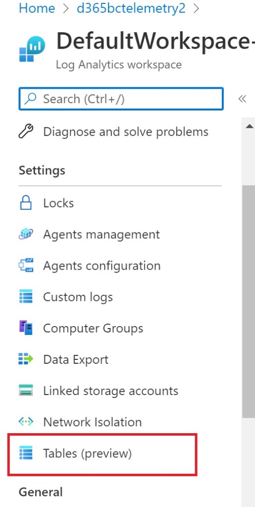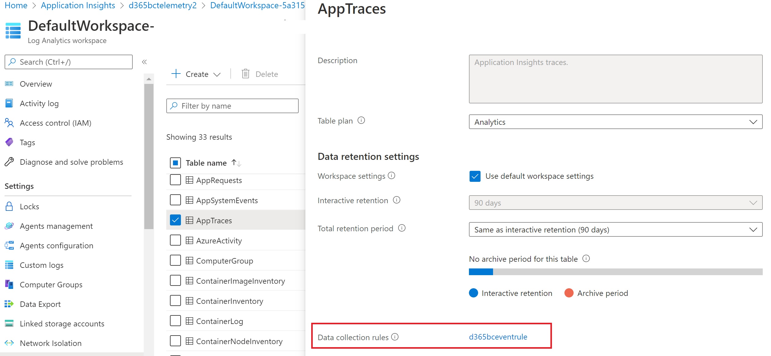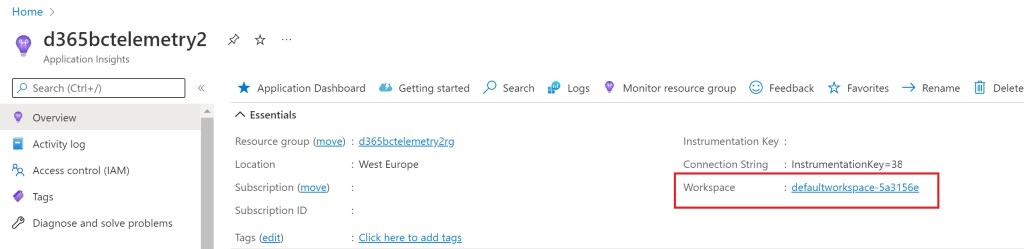 Open your Azure Application Insights instance and click on the workspace name associated to it: