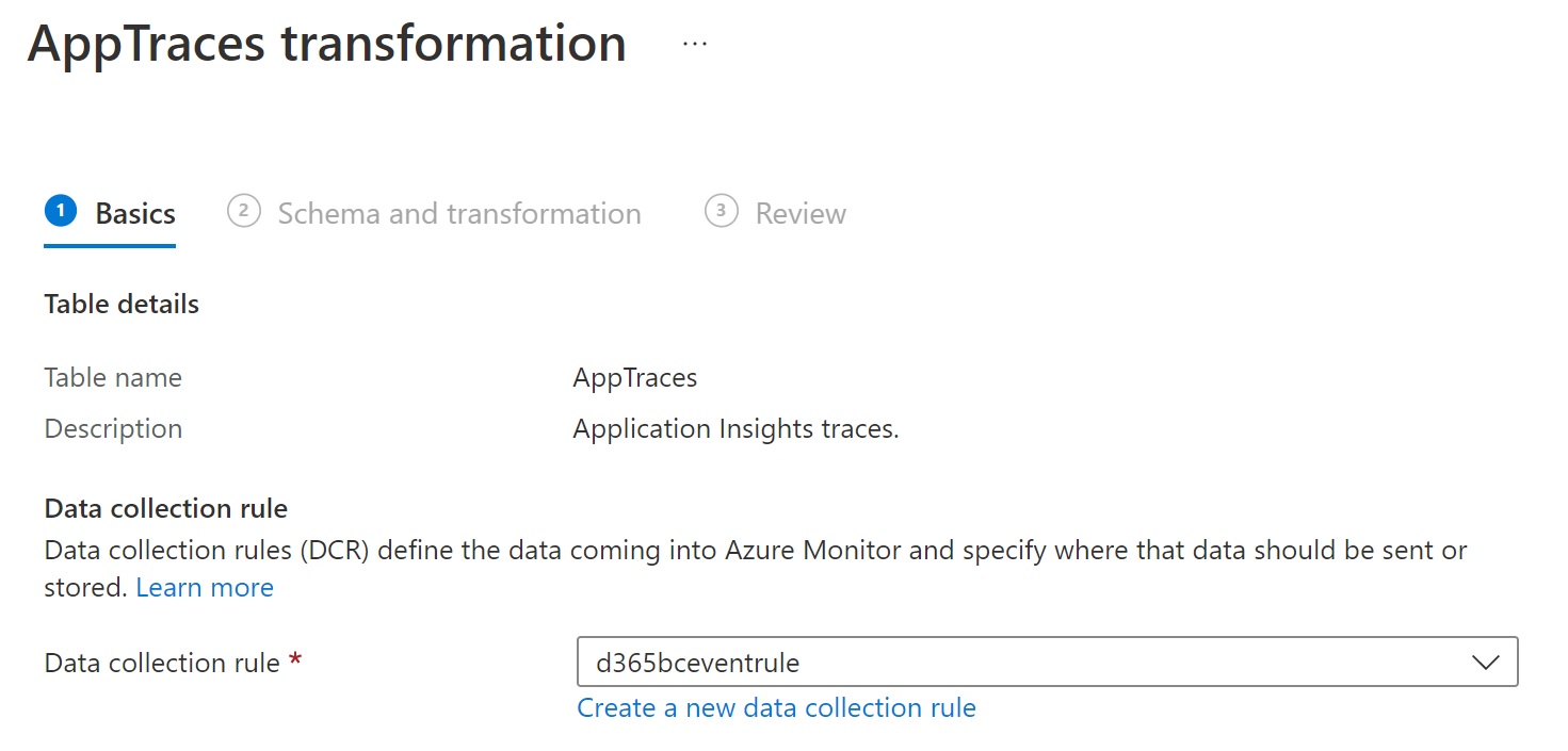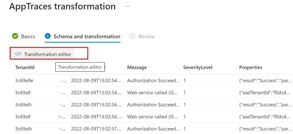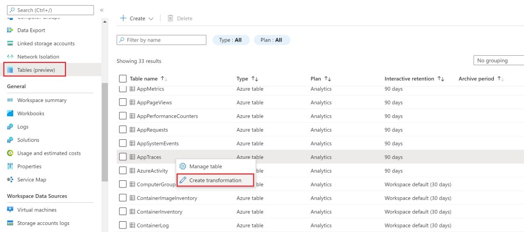 Here you have a list of Azure Application Insights tables that compose your telemetry store. Select the table called AppTraces, right click on it and select Create transformation:
