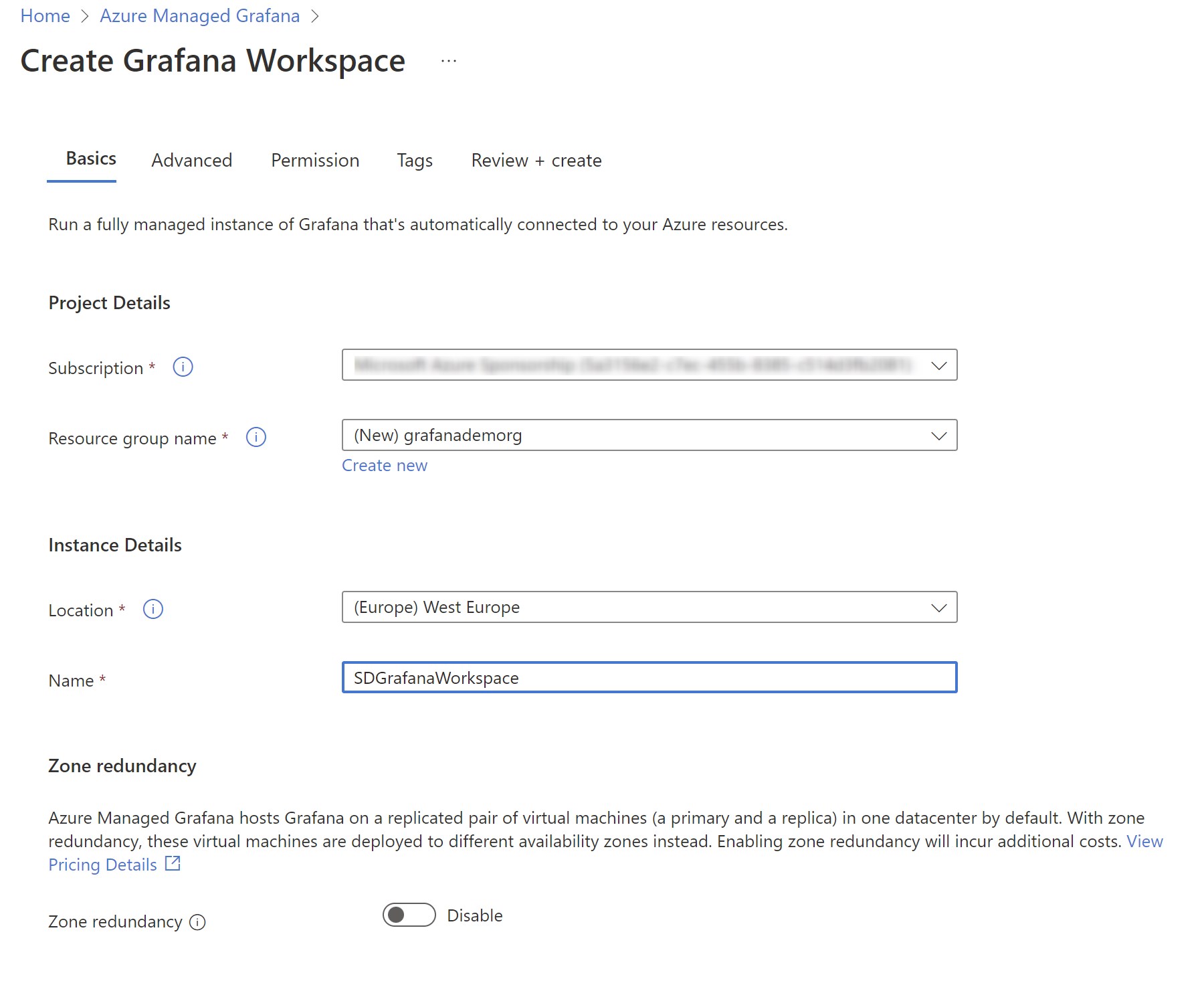 In the Basics tab you can sepcify the location and the name of your Azure Managed Grafana instance. You can also select if zone redundancy must be activated (zone redundancy is disabled by default. It automatically provisions and manages a standby replica of the Managed Grafana instance in a different availability zone within one region).