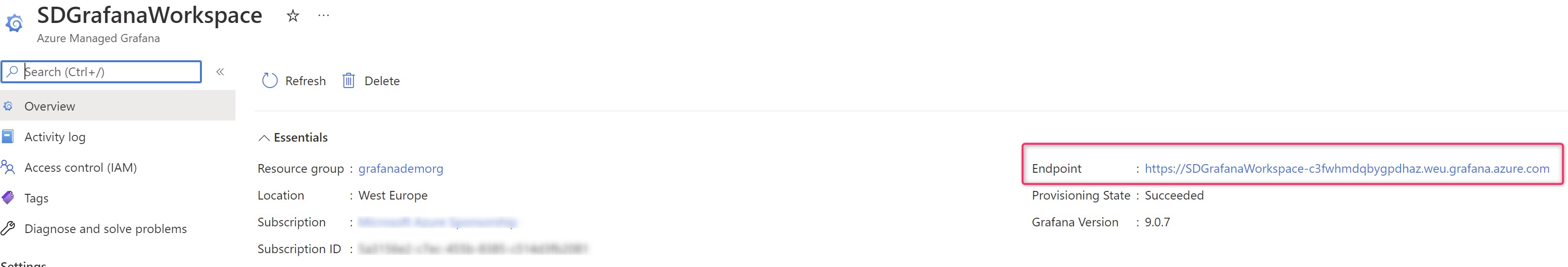 When the resource is provisioned, you have a new Grafana workspace created and here you can see the Endpoint field: