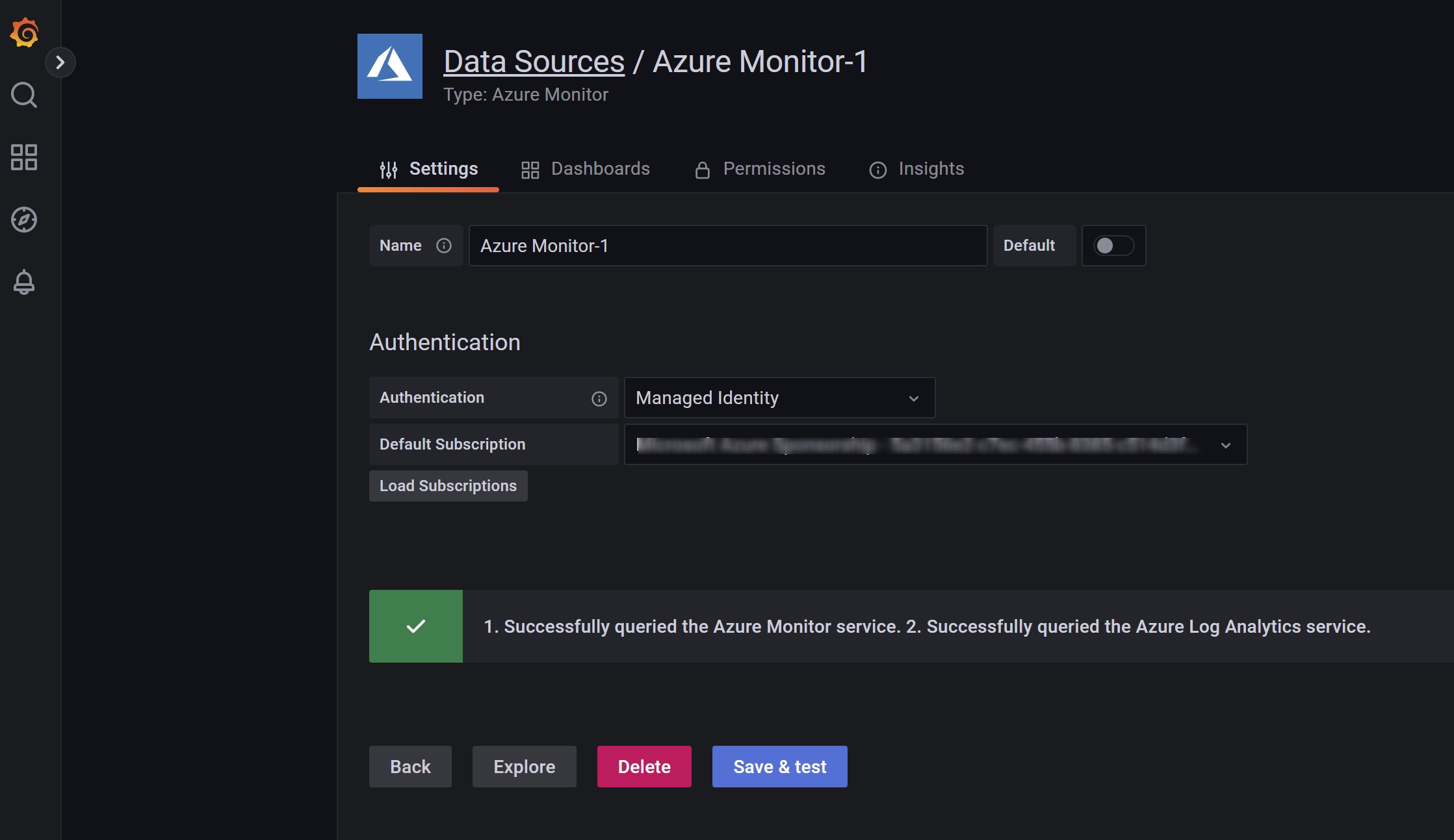 Azure Managed Grafana includes by default an Azure Monitor datasource plugin and by default, the plugin is pre-configured with a Managed Identity that can query and visualize monitoring data from all resources in the subscription in which the Grafana workspace was deployed.