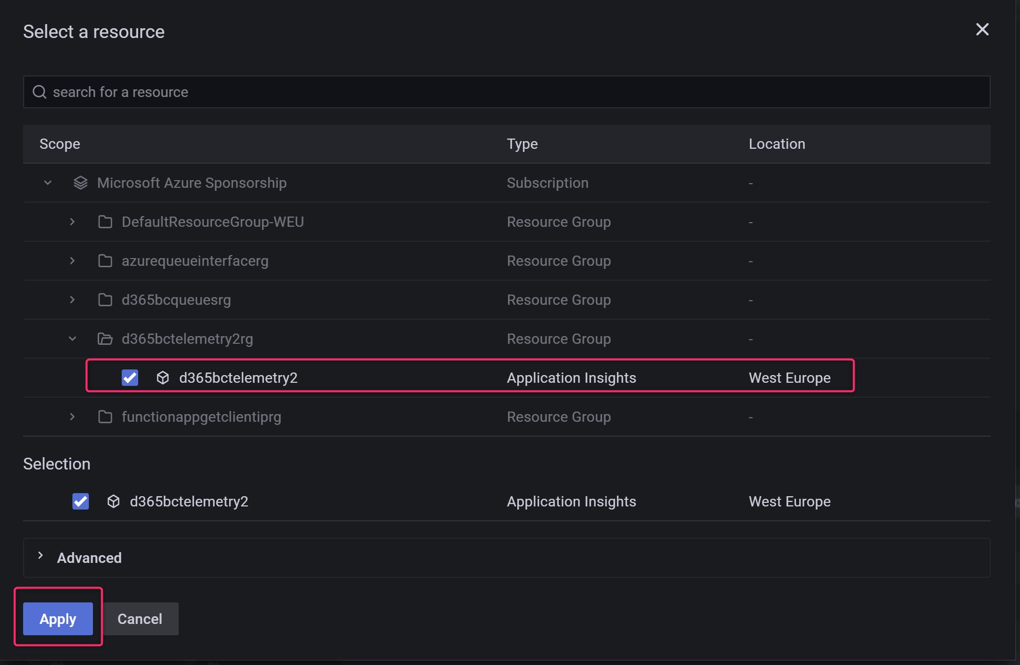 Here select your Azure Application Insights instance and click on Apply: