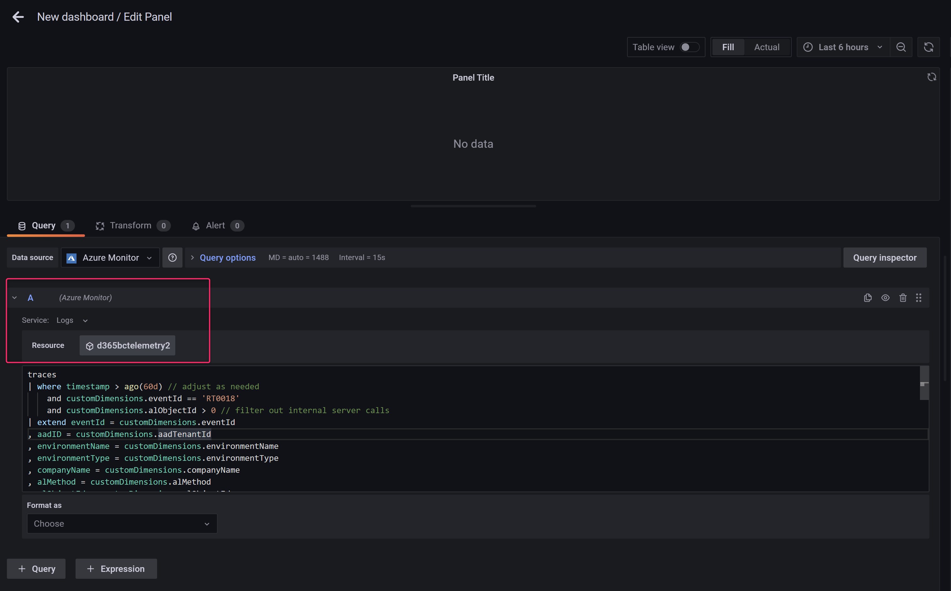 And what about if I want to analyze a custom KQL query? Select the data source and then select the Query panel. here you can write your KQL query (in this case I’m using a query that shows the long running AL methods):