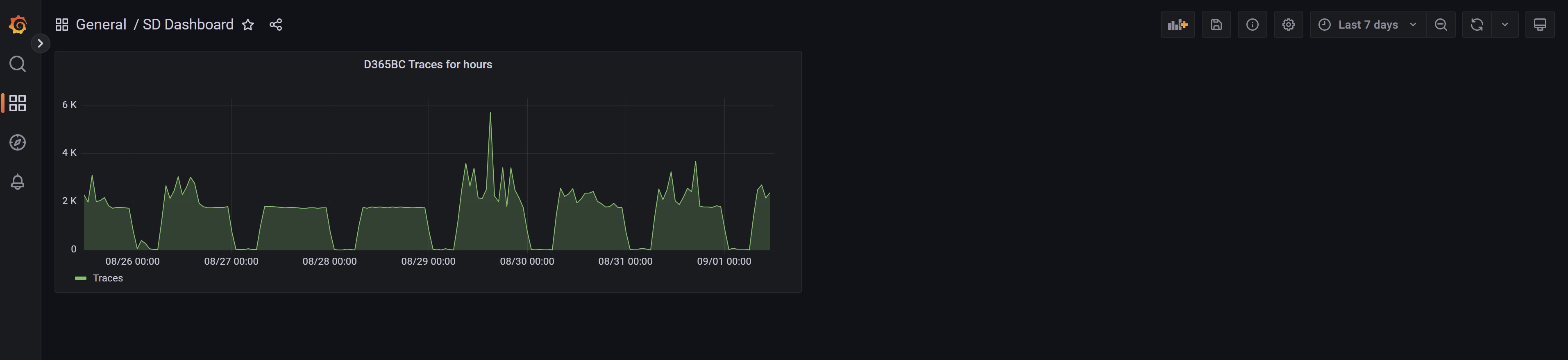 Now select the metric that you want to analyze (here for example I’ve created a time chart with the number of traces injected from Dynamics 365 Business Central during the day with a time frame of 15 minutes: