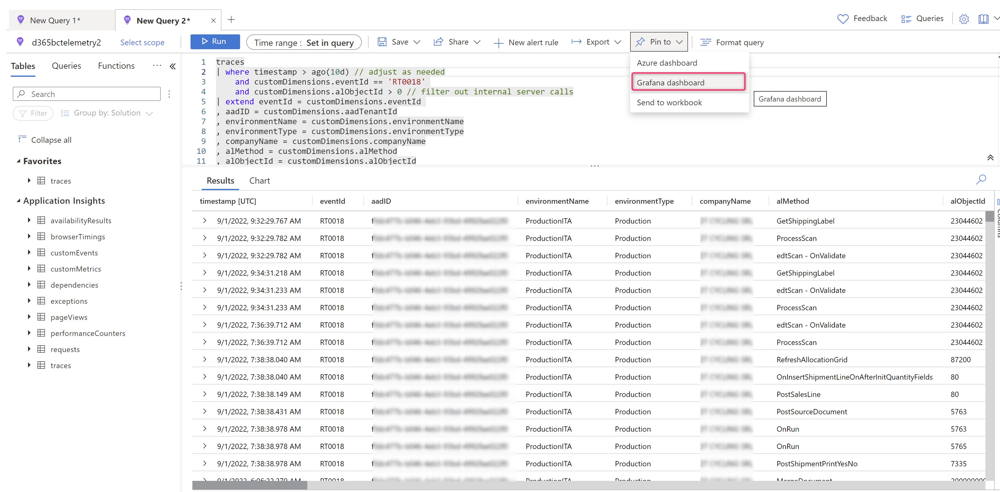 You can also pin to a Grafana dashboard tabular results that comes from Application Insights (not only charts). here for example I’m executing the Long Running AL KQL query from Application Insights Logs (tabular result) and then I pin these results to my Grafana dashboard: