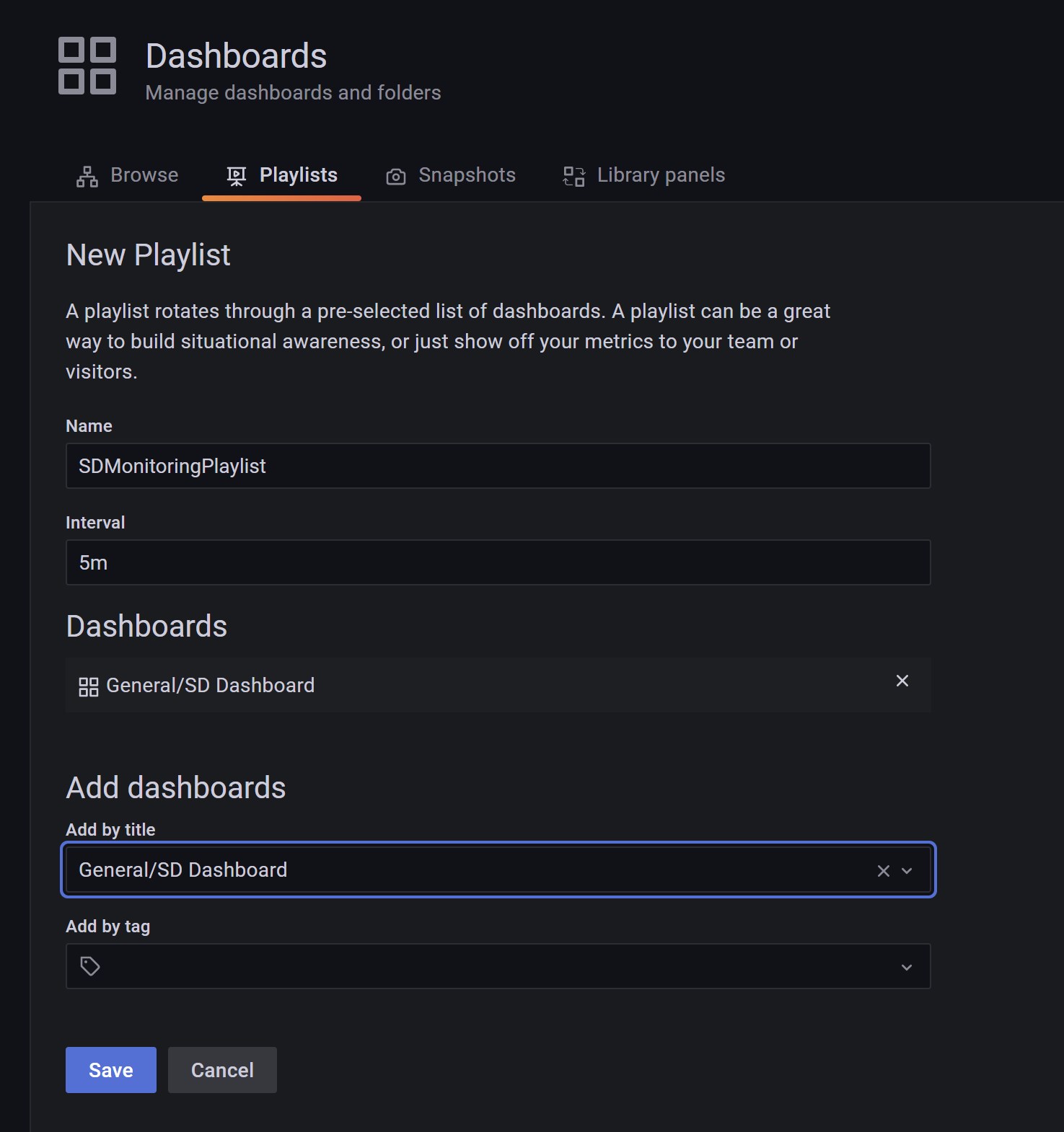 Then select the playlist name, the time interval to rotate dashboards and then add the dashboards that compose the playlist: