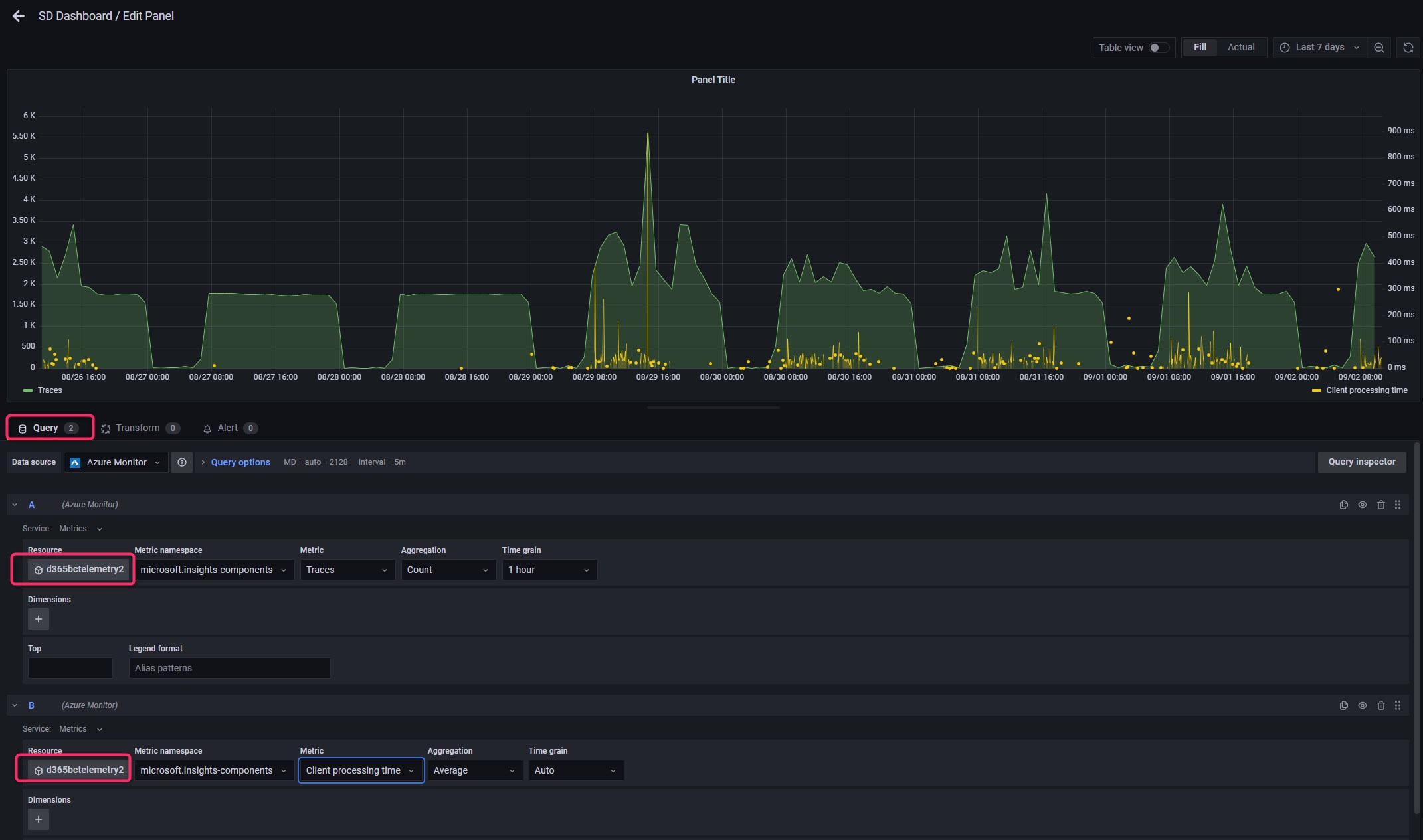 As said before, in a Grafana chart (or analysis) you can add multiple queries from multiple data sources (the data source here is at a per-query level). This is another feature that personally I love, because on the same analysis you can for example compare metrics that comes from two different sources, like for example 2 different Application Insights instances (alias, two Dynamics 365 Business Central tenants):