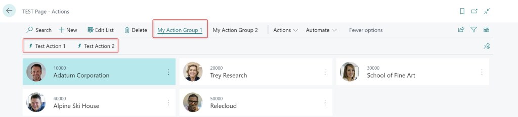 When I open my page, I have the two groups immediately visible. If I select Group 1, I can see my actions as in the following picture: