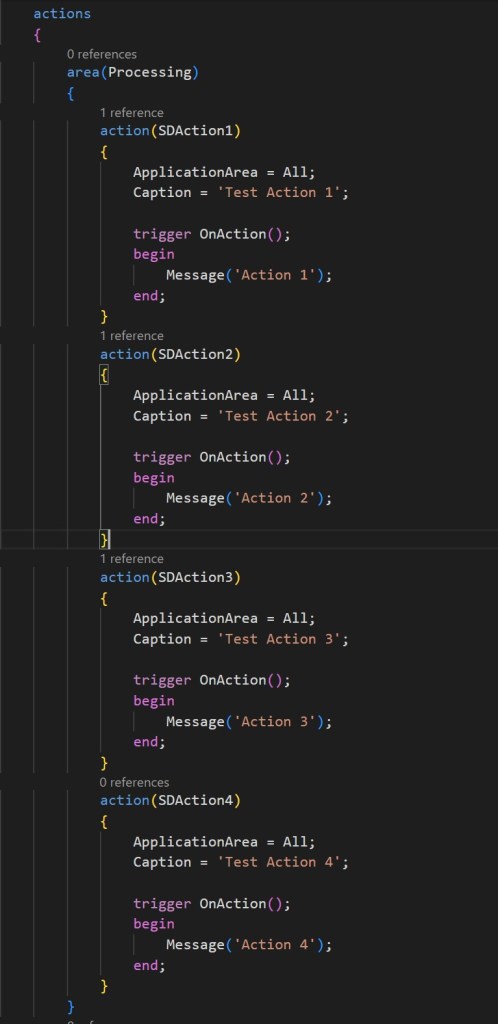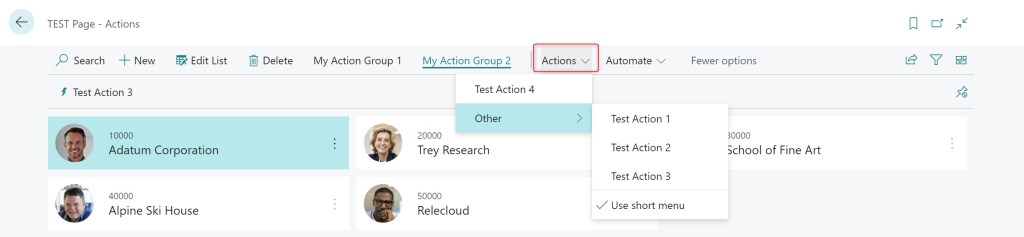 To show how this new feature works, I’ve created a simple page and on it I’ve defined 4 actions as follows: