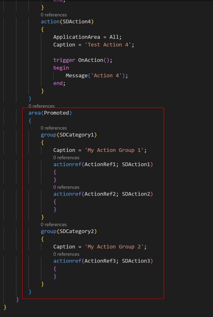 In the Promoted area you can define groups and you can add references to actions inside that group by using the new actionref keyword. The actionref keyword defines a reference in the promoted area to an existing action on the page.