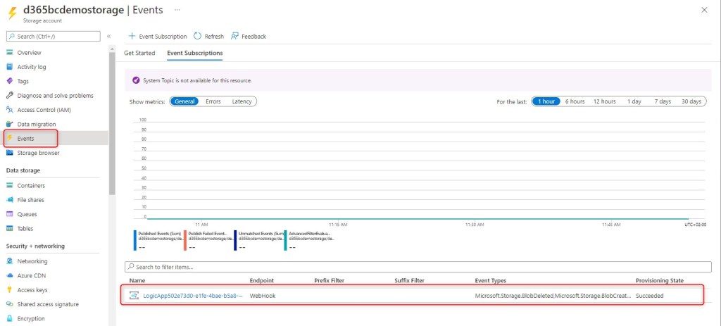 "topic": "/subscriptions/YOURSUBSCRIPTIONID/resourceGroups/d365bcdemo/providers/Microsoft.Storage/storageAccounts/d365bcdemostorage",
