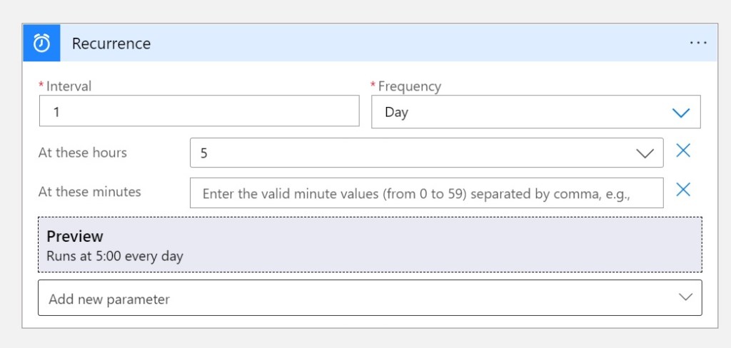 If you only add the parameter At these hours = 5 and leave the parameter At these minutes as blank, the workflow will start at any minutes after 5:00. There’s no guarantee that it will be fired exactly at 5:00: