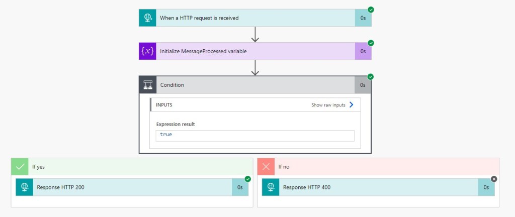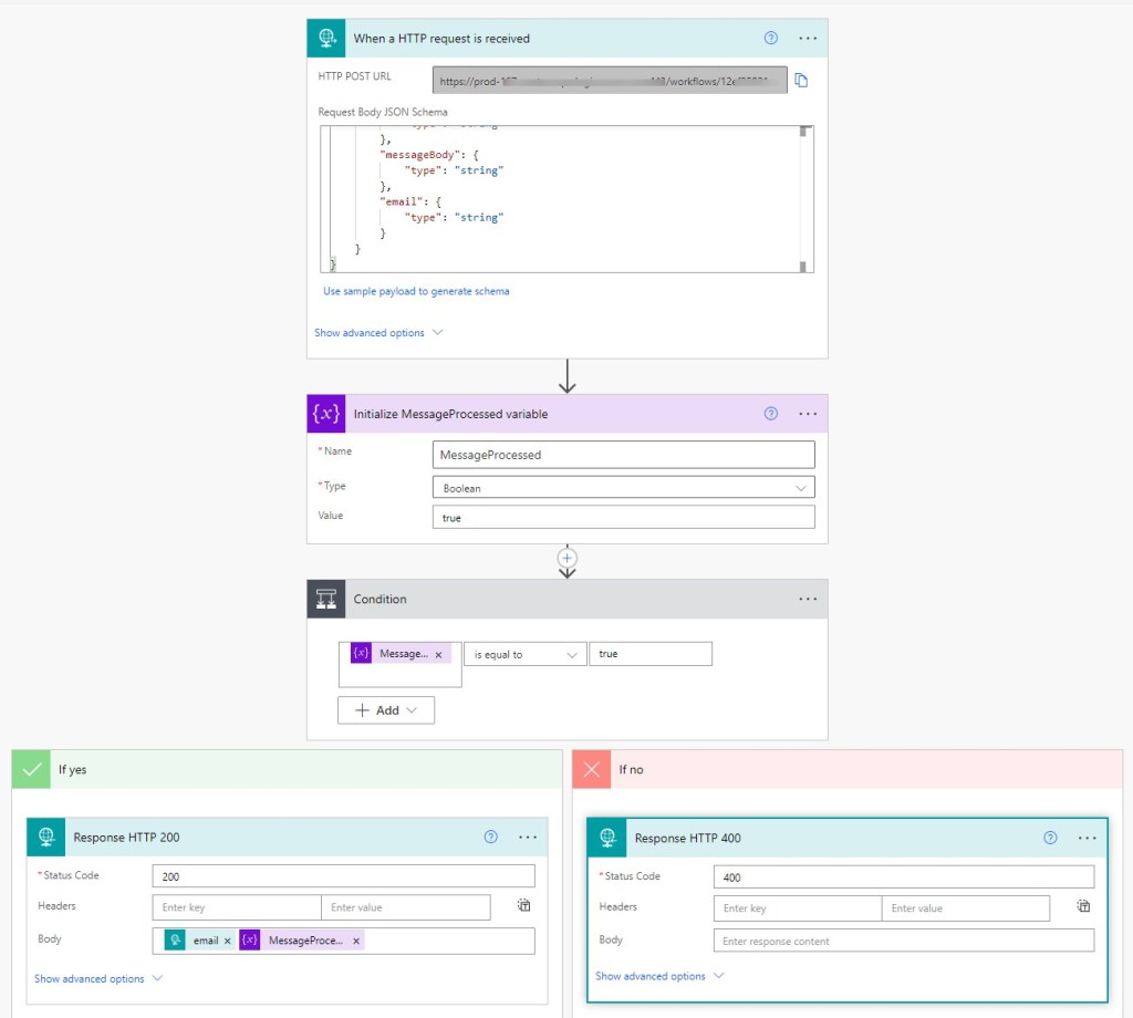 Then the workflow performs some actions you want (like composing an email message with the details in input) and here I simply assing a value to a variable (MessageProcessed set to true). Then, if the MessageProcessed variable is true, the workflow completes successfully (HTTP response 200) otherwise it throws an error (HTTP response 400). Very easy…