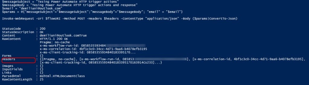 Now let’s trigger the workflow by sending an HTTP request to the workflow url (I’m using Powershell for that here). When triggered, the workflow is successfully executed: