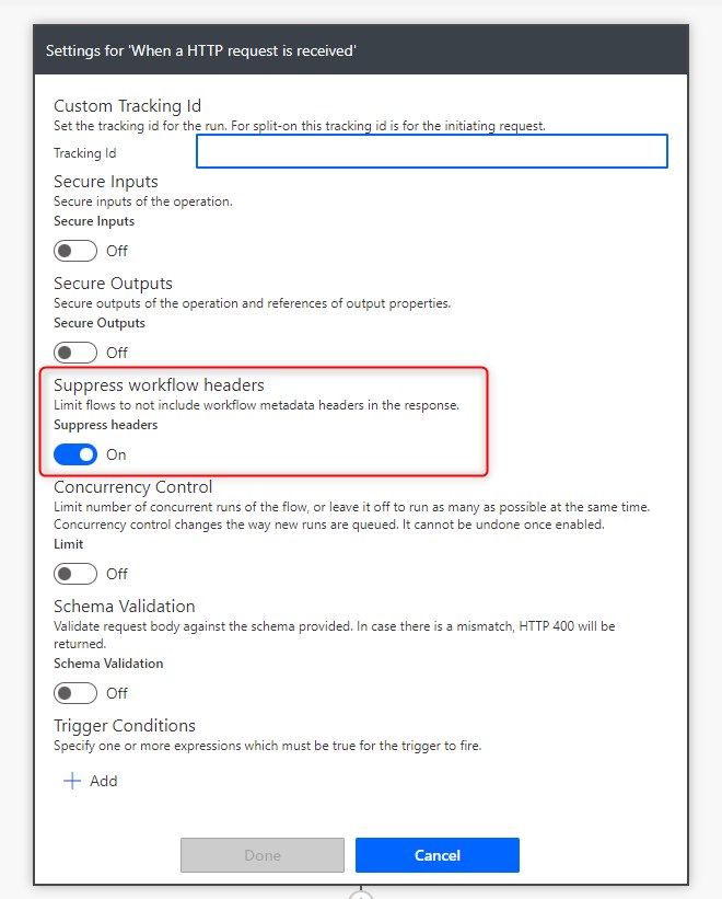 I think this in not a well-known feature for most of the Power Automate users but on the “When an HTTP request is received” trigger you can click on Settings and then set the Suppress workflow headers option to On. This option permits you to not include workflow metadata headers in the Http response of the flow:
