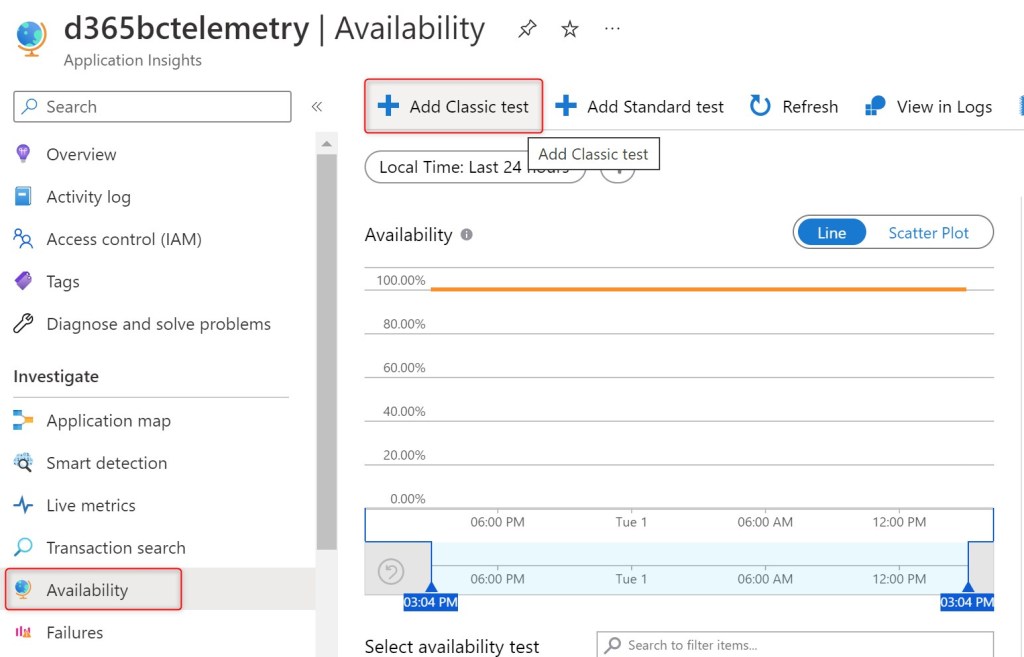 To create an availability test with Azure Monitor, select an Azure Application Insights instance, then click on Availability and then on Add Classic test: