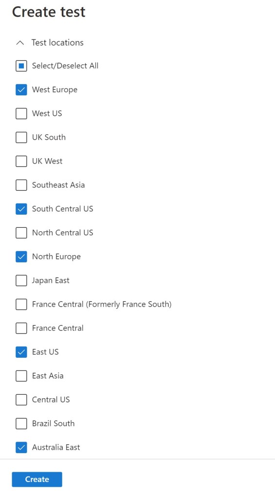 When you create an availability test, it’s important to test from multiple locations. If you click on Test locations you can select the Azure Regions where web requests are sent to your URL. It’s recommended to have a minimum of 5 test locations to ensure that you can distinguish problems in your website from network issues. You can select up to 16 locations: