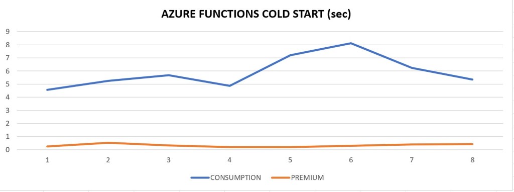This is a chart that shows the measure of cold start (in seconds) when using one of my Azure Functions in Consumption and Premium tier: