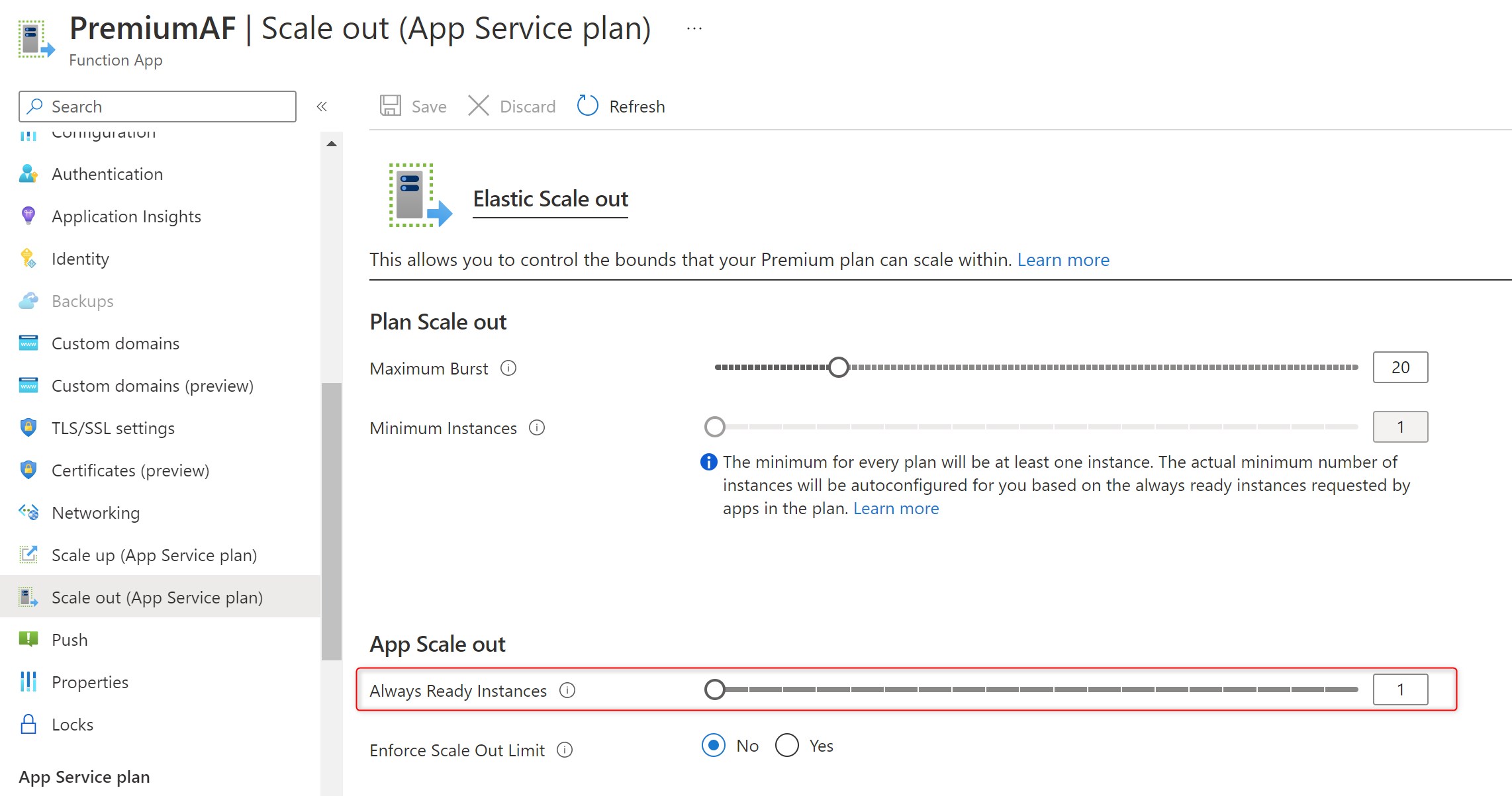 When your Function app is deployed in the Premium plan, if you select the Scale out (App Service Plan) menu, you can see the following: