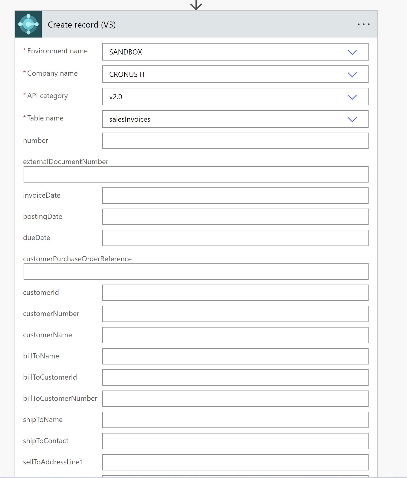 This happens because the majority of the Power Automate actions in the Business Central connector have dynamic inputs. This means that the same action can have different inputs accordingly to the context. As an example, if you select the Create Record (V3) action, the input fields that this action presents to you are different if you want to create for example a Customer record and a Sales Invoice record.