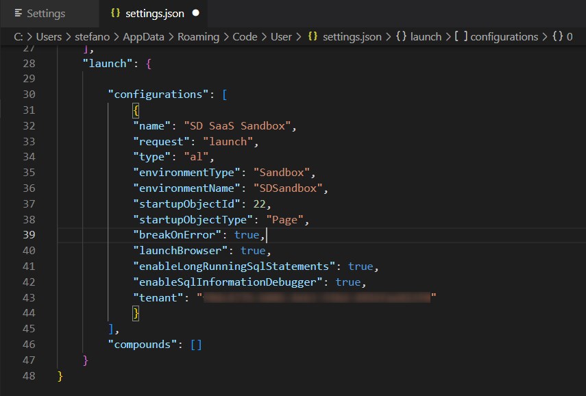 In case that the local launch.json file doesn’t contain a valid AL launch configuration, the compiler will try to find one in the code-workspace first, and then in the settings.json files. However, if the launch property is specified in the code-workspace file even without specifying a valid AL configuration, the global settings.json file will not be able to override it.