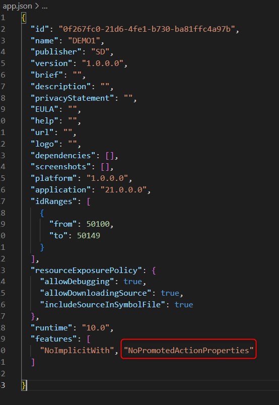 - A new “NoPromotedActionProperties” option in the app.json file to enforce the usage of the promoted area and actionref syntax in the extension: